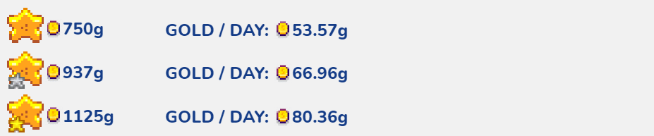 A starfruit is a crop that is obtainable in summer, . The crop takes 13 days to grow and you will recieve 1 per harvest. It can be sold at a base price of 750g, 937g for the silver quality, and 1125g for the gold quality. When consumed, you will recieve a boost of 125 energy, and 56 health.
