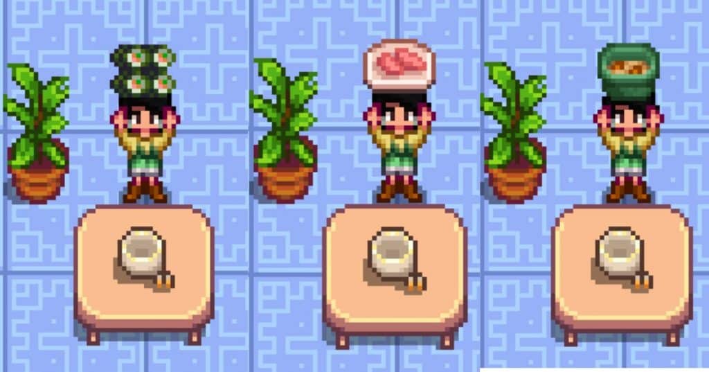 | Trout Soup | • Rainbow Trout (1) • Green Algae (1) | +100 | +180 | +45 | +81 | +1 Fishing (4 minutes and 39 seconds) | None | 100g | 150g | Tune in The Queen of Sauce in Year 1, Fall 14 |