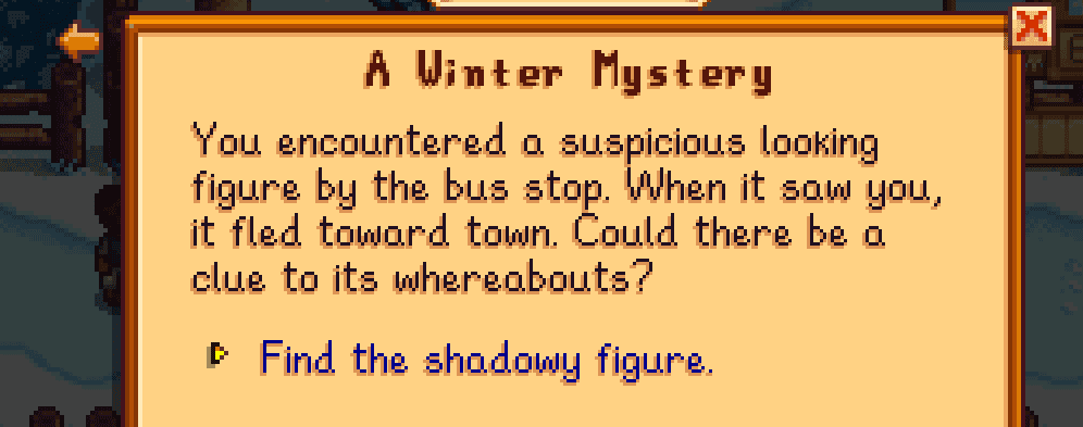 After the cut-scene concludes, you’ll find the quest “A Winter Mystery” in your journal. All of your Stardew Valley quests can be found there.