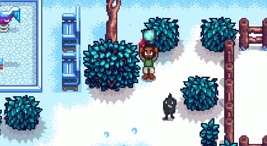 Finding the shadowy figure is easier than one might expect! As there is snow everywhere, you can follow the figure’s footprints to find its hiding spot. Head towards Pelican Town from the Bus Stop and find the footprints in the snow.